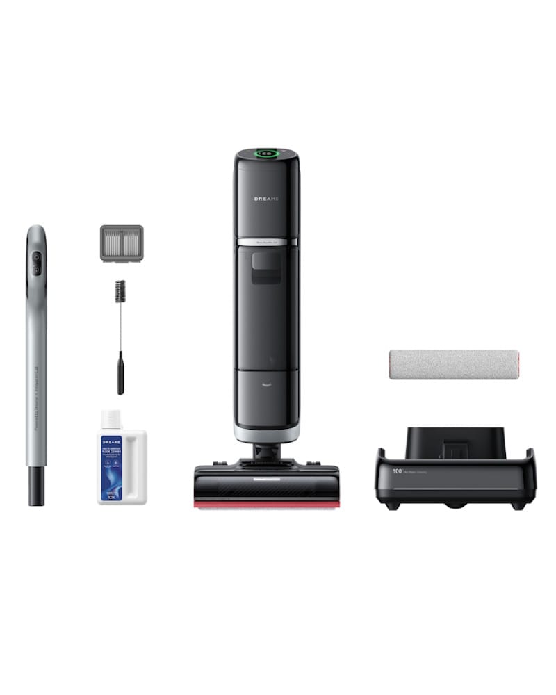 De Dreame H15 Pro Heat wordt geleverd met een reinigings- en laadstation, adapter, extra borstel, extra filter, reinigingsmiddel, schoonmaakborstel en een handleiding.