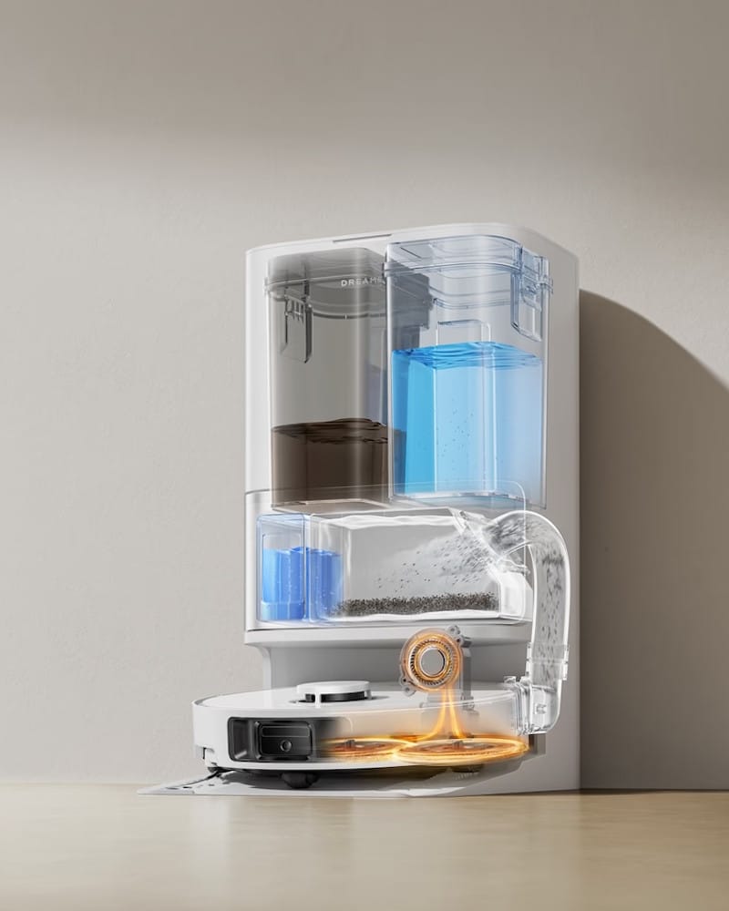 Het alles-in-één station is ontworpen om zoveel mogelijk werk uit handen te nemen. De Dreame L10s Ultra Gen 3 Set leegt zichzelf automatisch in de 3,2L stofzak en vult het verse water van de robot bij. Het systeem is daarnaast ook voorzien van een speciaal reservoir voor het automatisch toevoegen van schoonmaakmiddel aan het water waar de borstels mee worden gewassen.