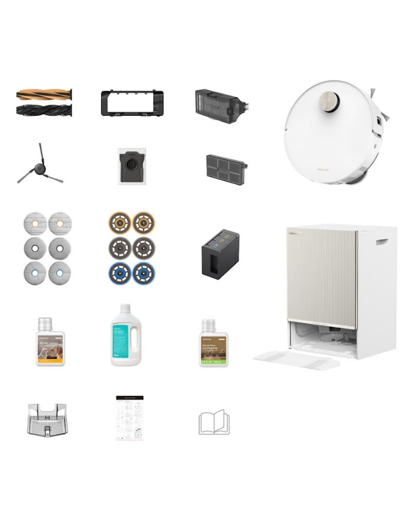 De Dreame Matrix10 Ultra wordt geleverd met een basisstation, hoofdborstel, 6 dweilpadhouders, 12 dweilborstels, schoonmaakmiddel(en), 2 extra zijborstel, 2 extra filters, 2 extra stofzakken en een handleiding.