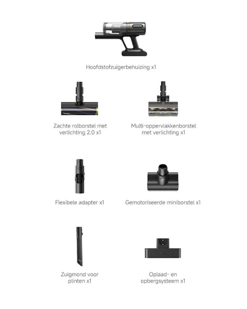 De Dreame R20 Slim wordt geleverd met een houder- en laadstation, adapter, multivloer borstel, zachte rolborstel, mini borstel, kierenmondstuk, flexibel tussenstuk en een handleiding.