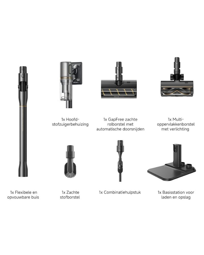 De Dreame V20 Pro wordt geleverd met een basisstation, adapter, GapFree zachte rolborstel, multi-vloer borstel, zachte stofborstel, een combi-tool en een handleiding.
