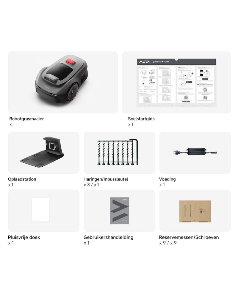 De Mova ViAX 250 wordt geleverd met een laadstation, adapter, schroeven en inbussleutel, reinigingsdoek, 9 extra messen en een handleiding.