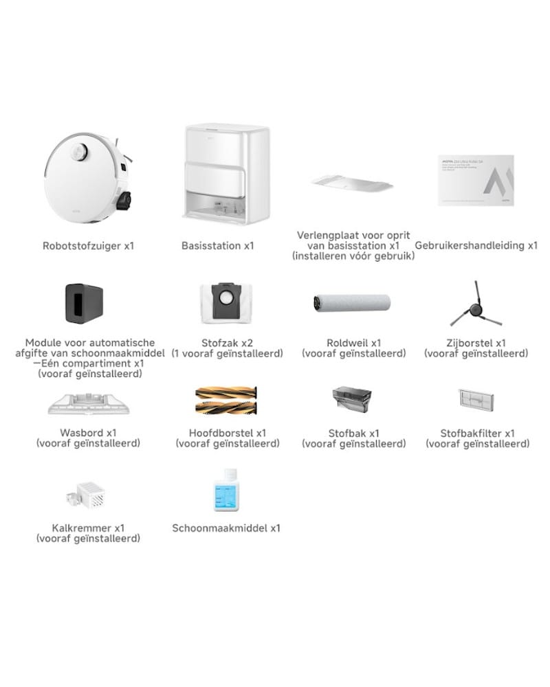 De Mova Z60 Ultra Roller SA wordt geleverd met een basisstation, hoofdborstel, zijborstel, dweilborstel, 2 stofzakken, schoonmaakmiddel en een handleiding.